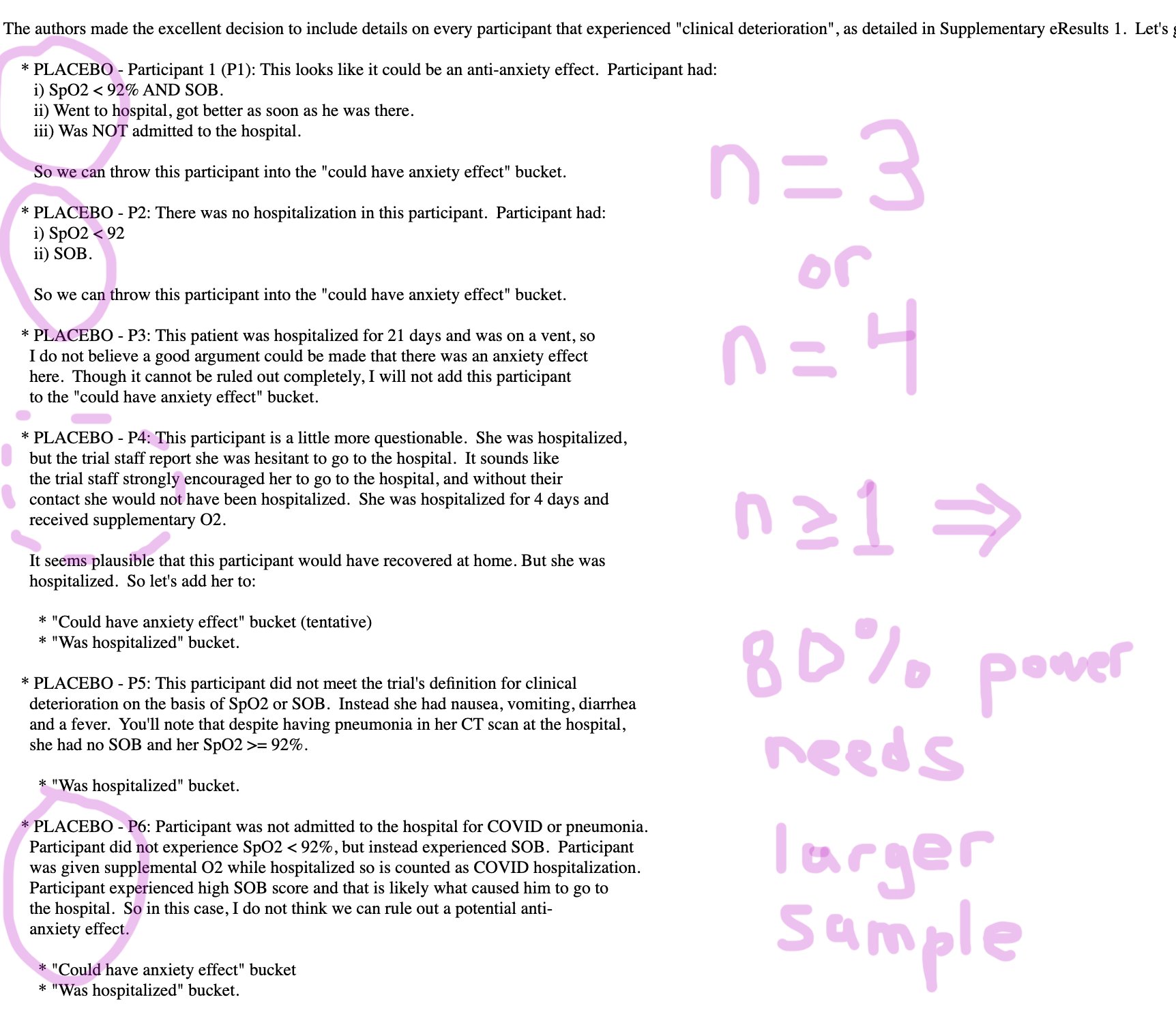 How can the new RCT help? I believe that hard endpoints such as SpO2 could be tracked. I also believe that other trials, such as in patient populations with higher event rates (e.g. higher risk patients) or in early hospitalized cases would go a long way to making this completely clear. It is also possible that the combined figures from the new RCT, even if terminated early for meeting it's primary outcome with statistical significance (say ~200 participants in interim / early termination) can be combined with the previous RCT's numbers to reach significance modulo anxiety effects.